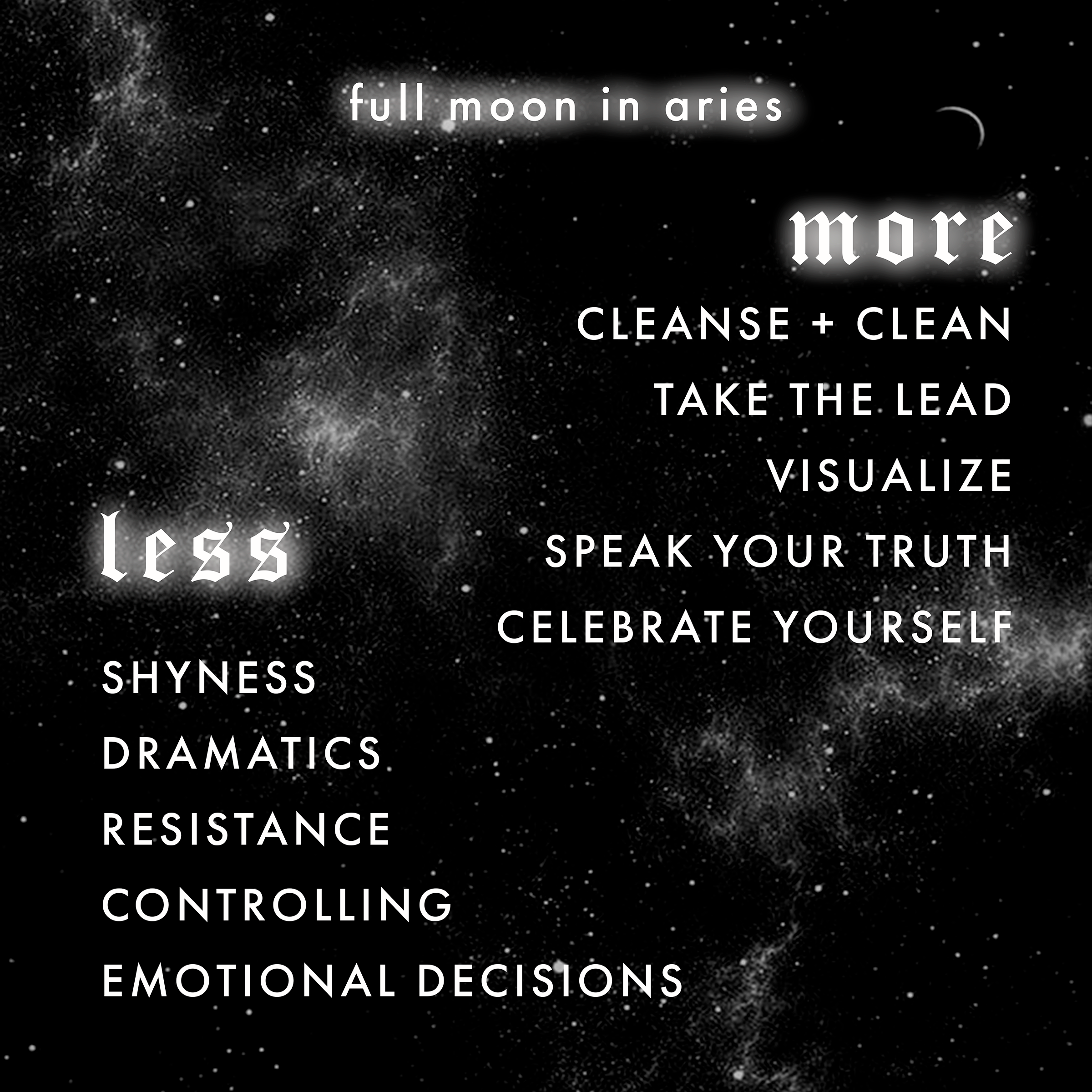 Aries rules the Self - our individuality, our personal mission, and our confidence to follow our passions and be the leader of our life. With this Full Moon, we recognize and celebrate ourselves for persevering through the obstacles we’ve faced and following the call of our path with courage and strength.